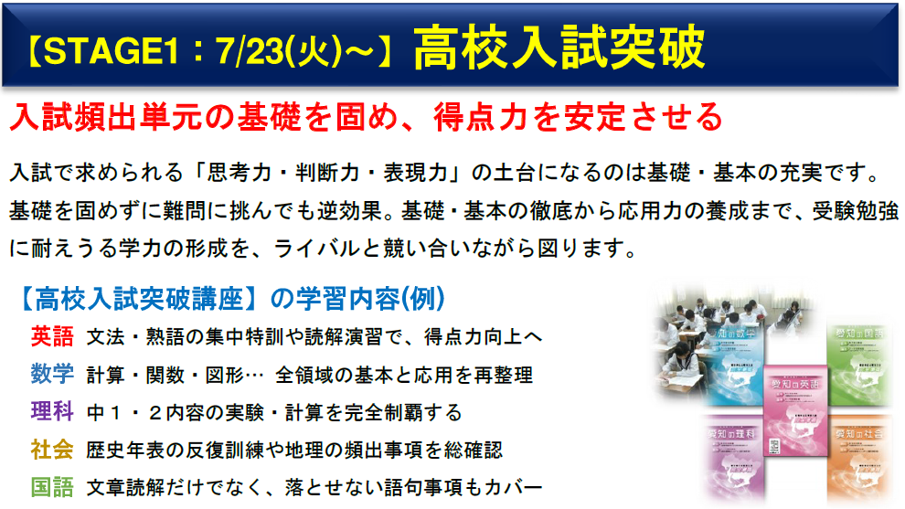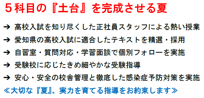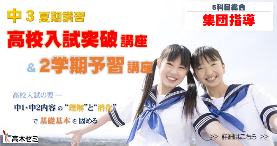 ≪講座の詳細/全8回≫【校 舎】 高木ゼミ 知多本校 / 常滑本郷校【日 程】 夏期講習カレンダー からご確認ください【受講費】 22,000円(税込/別途 全県模試代 4,200円が必要です)